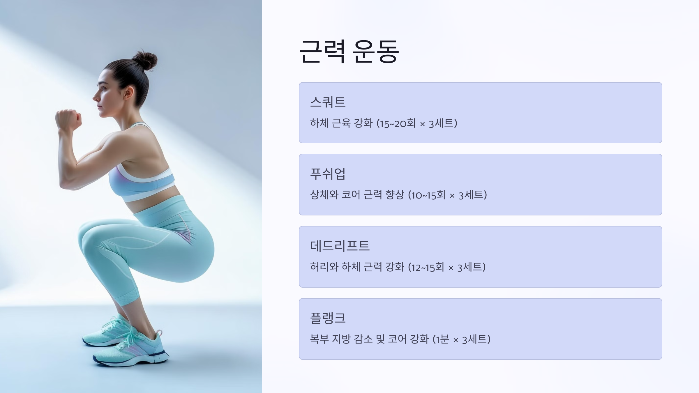 | 🏋️♂️ 스쿼트 | 15~20회 × 3세트 | 하체 근육 강화 & 기초대사량 증가 |