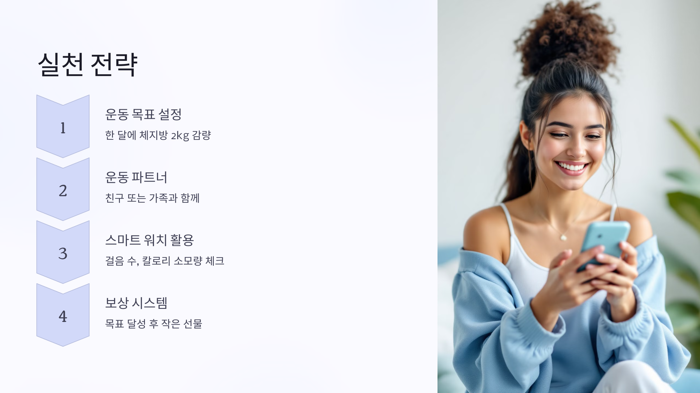 🏆 운동 목표 설정하기: "한 달에 체지방 2kg 감량!", "하루 5,000보 걷기"와 같이 구체적인 목표를 설정하세요.