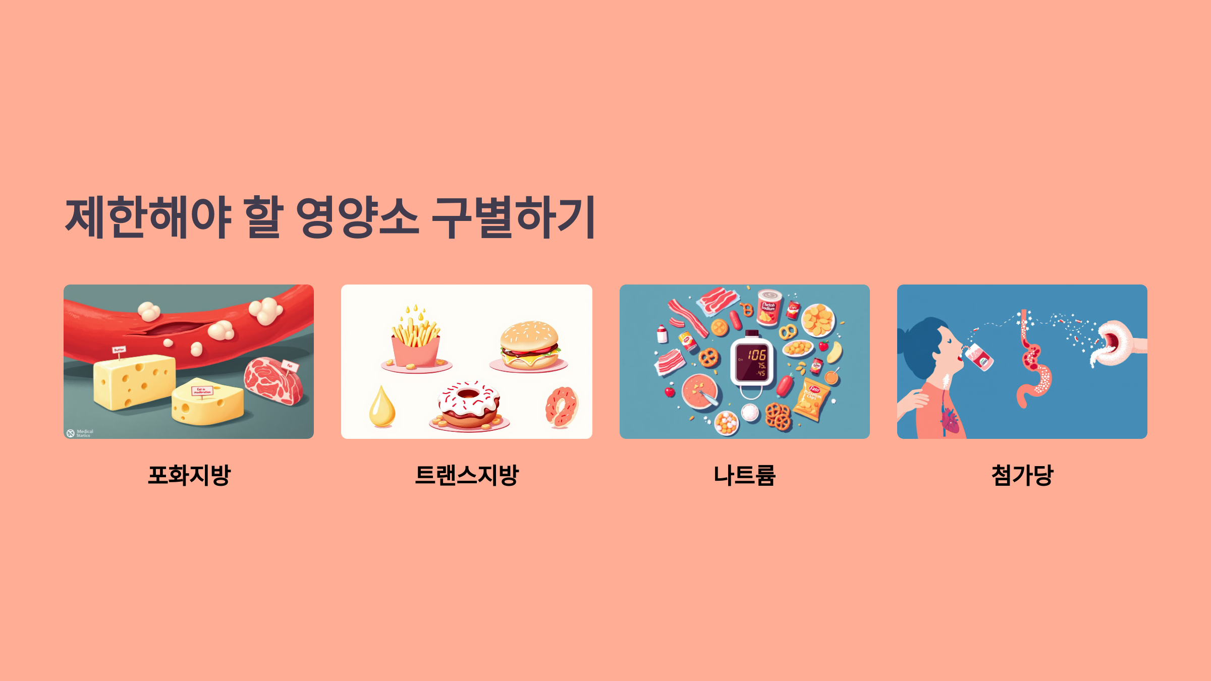 - 포화지방: LDL(나쁜 콜레스테롤)을 증가시켜 심혈관 질환 유발