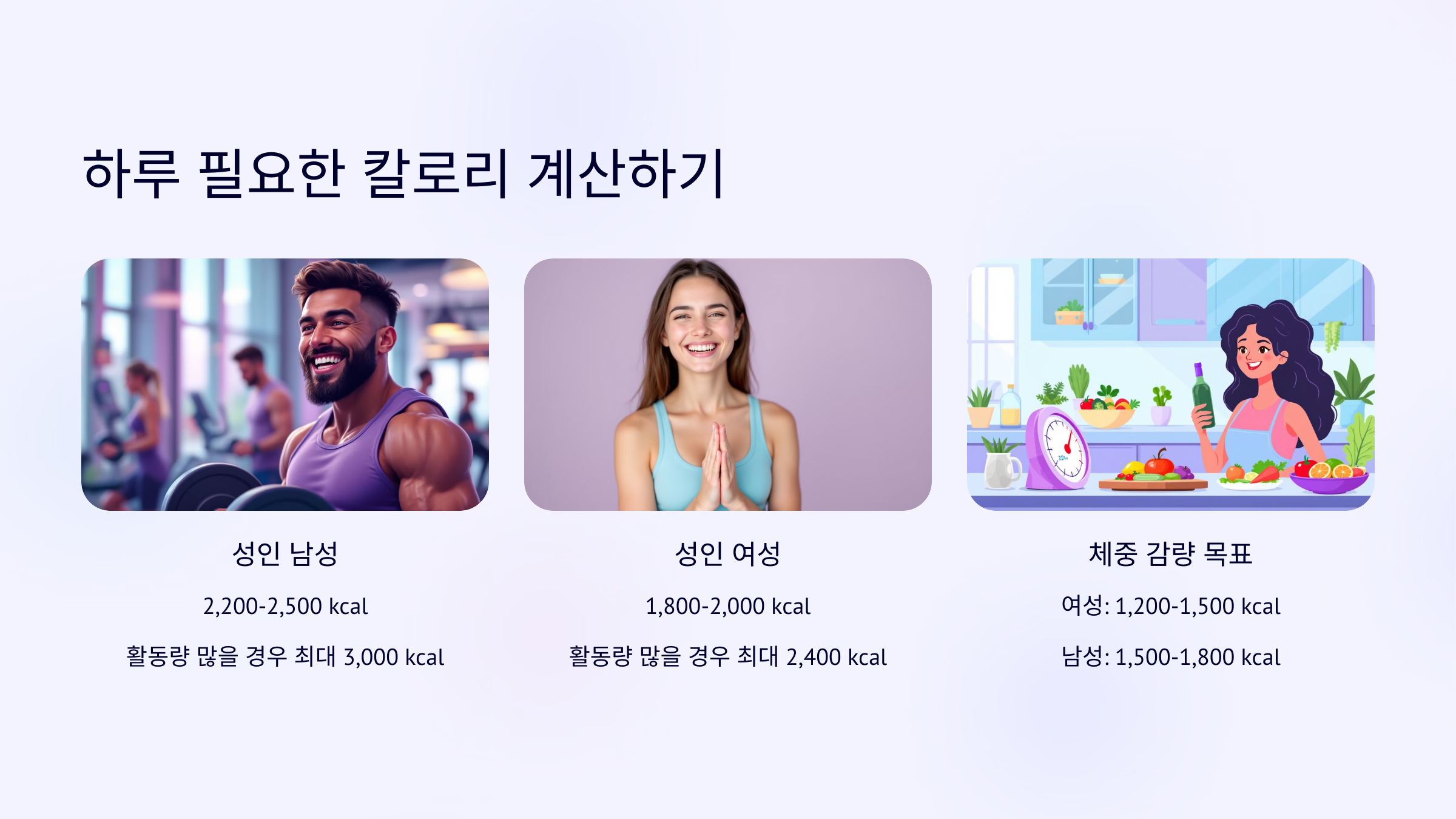 - ✅ 성인 남성: 2,200~2,500 kcal (활동량이 많을 경우 최대 3,000 kcal)