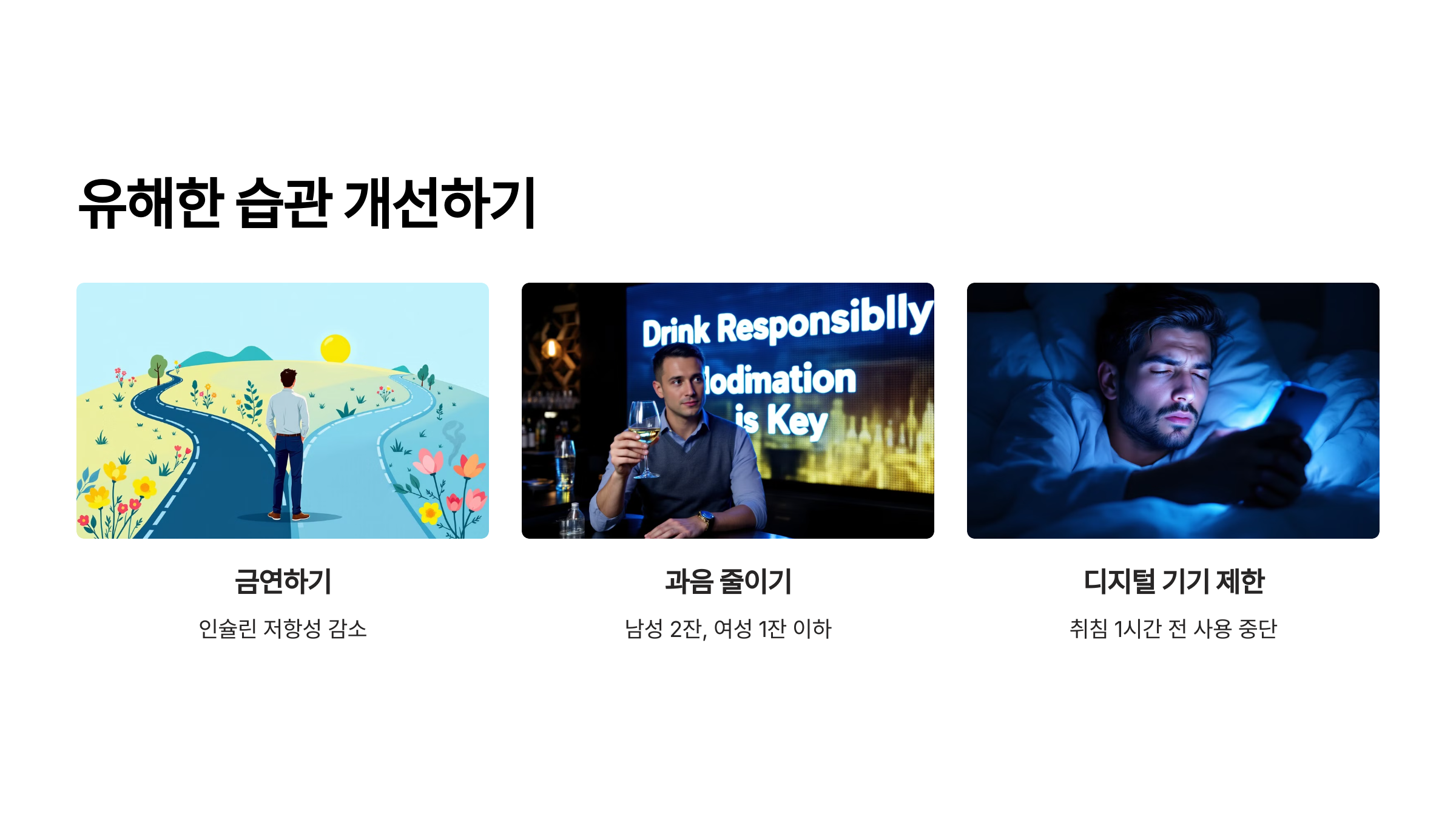 - ✅ 금연하기 - 흡연은 인슐린 저항성을 높이고 심혈관 질환의 위험을 증가시킵니다. 금연을 통해 건강을 지키세요.