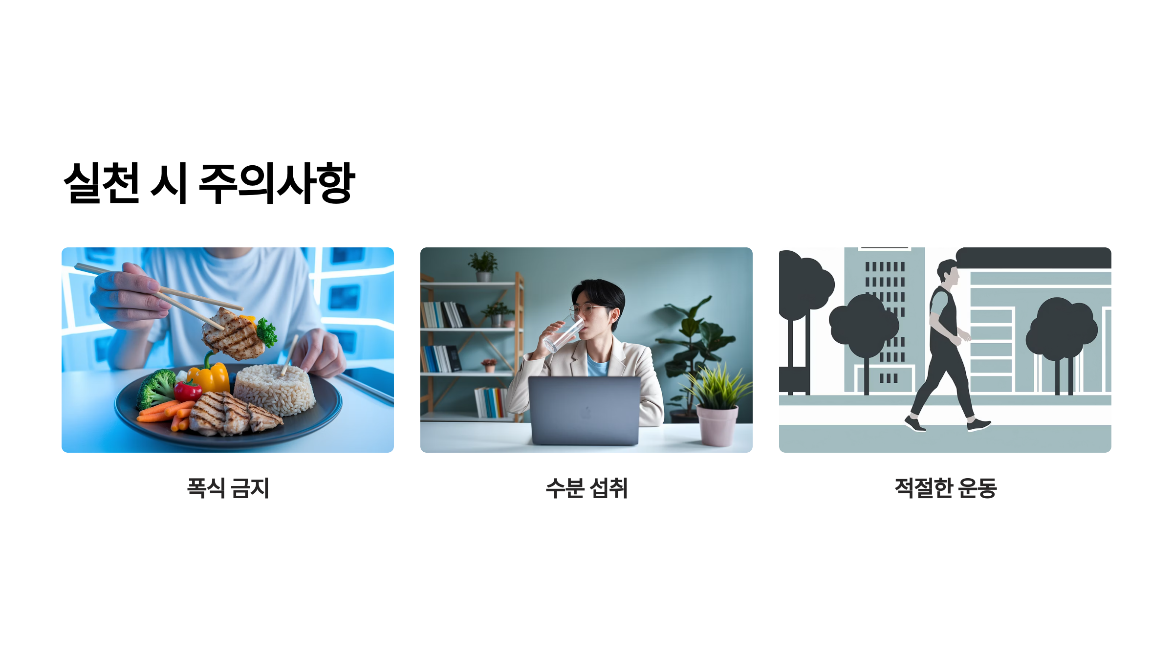 - 식사 시간에 폭식 금지 – 고단백 + 식이섬유 중심의 균형 잡힌 식사 필요