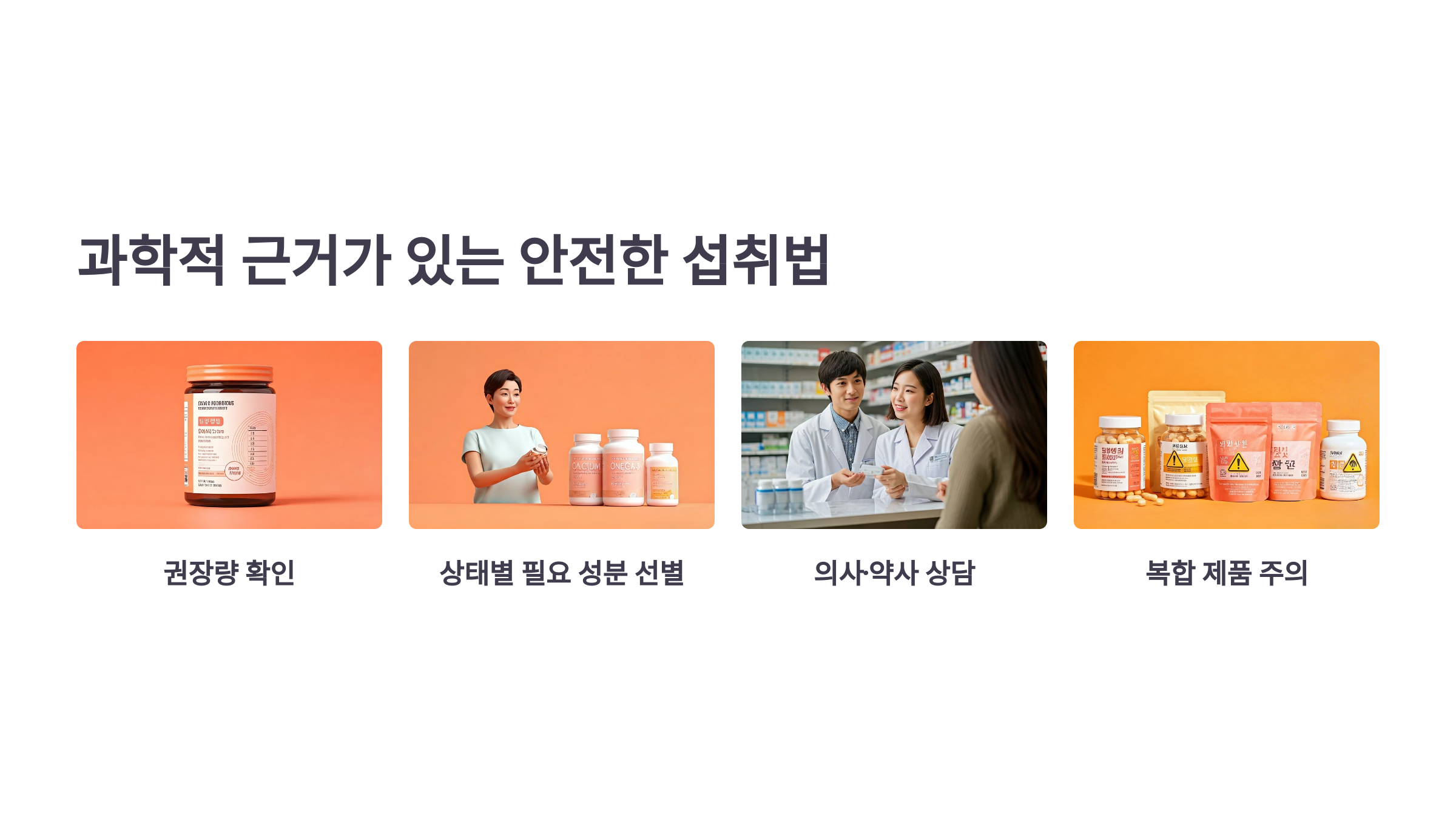 - 의사, 약사와 상담 후 맞춤형 섭취 계획 수립이 가장 안전합니다.