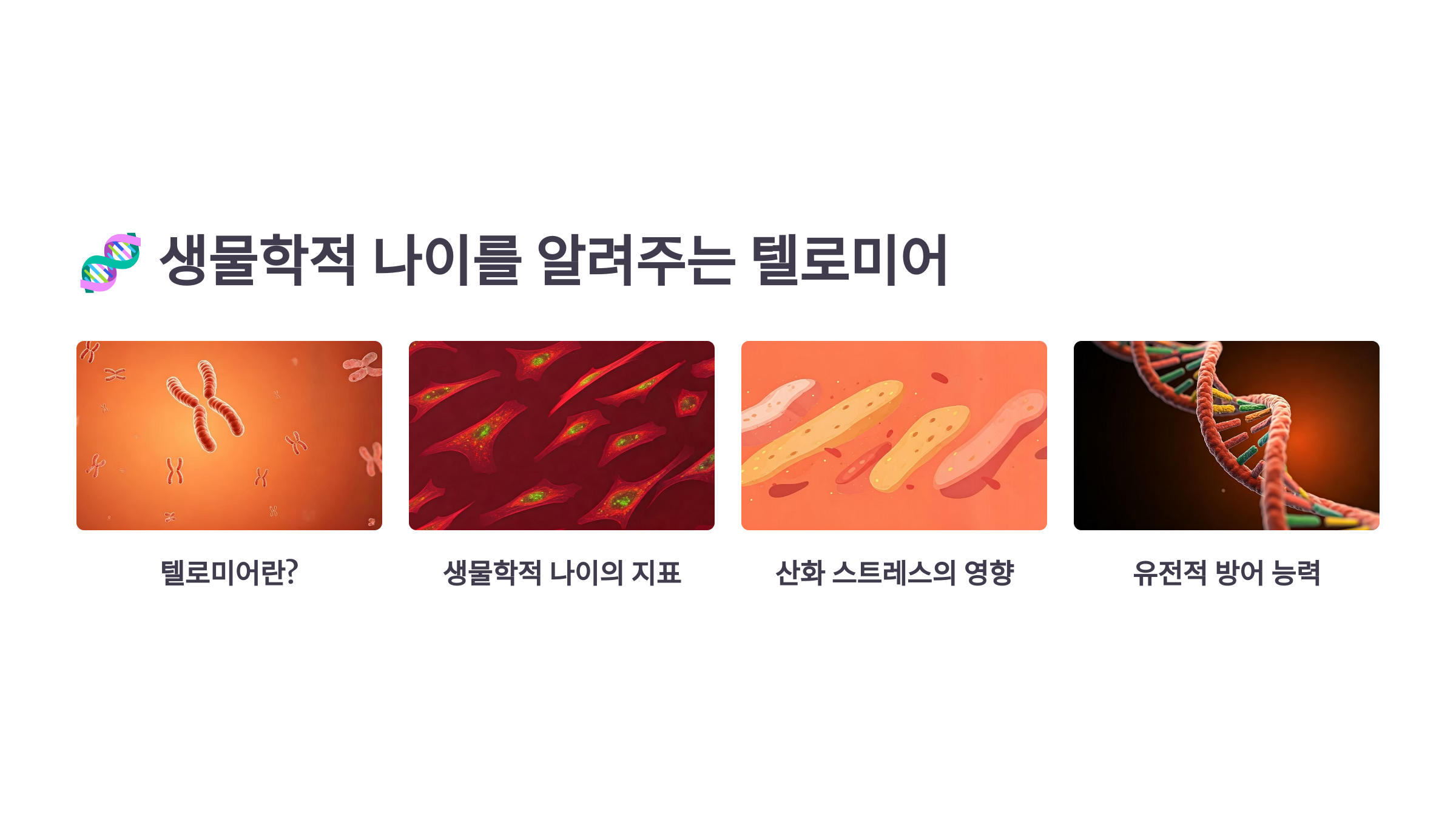 이 생물학적 나이를 측정하는 대표적인 지표가 바로 ‘텔로미어’예요.