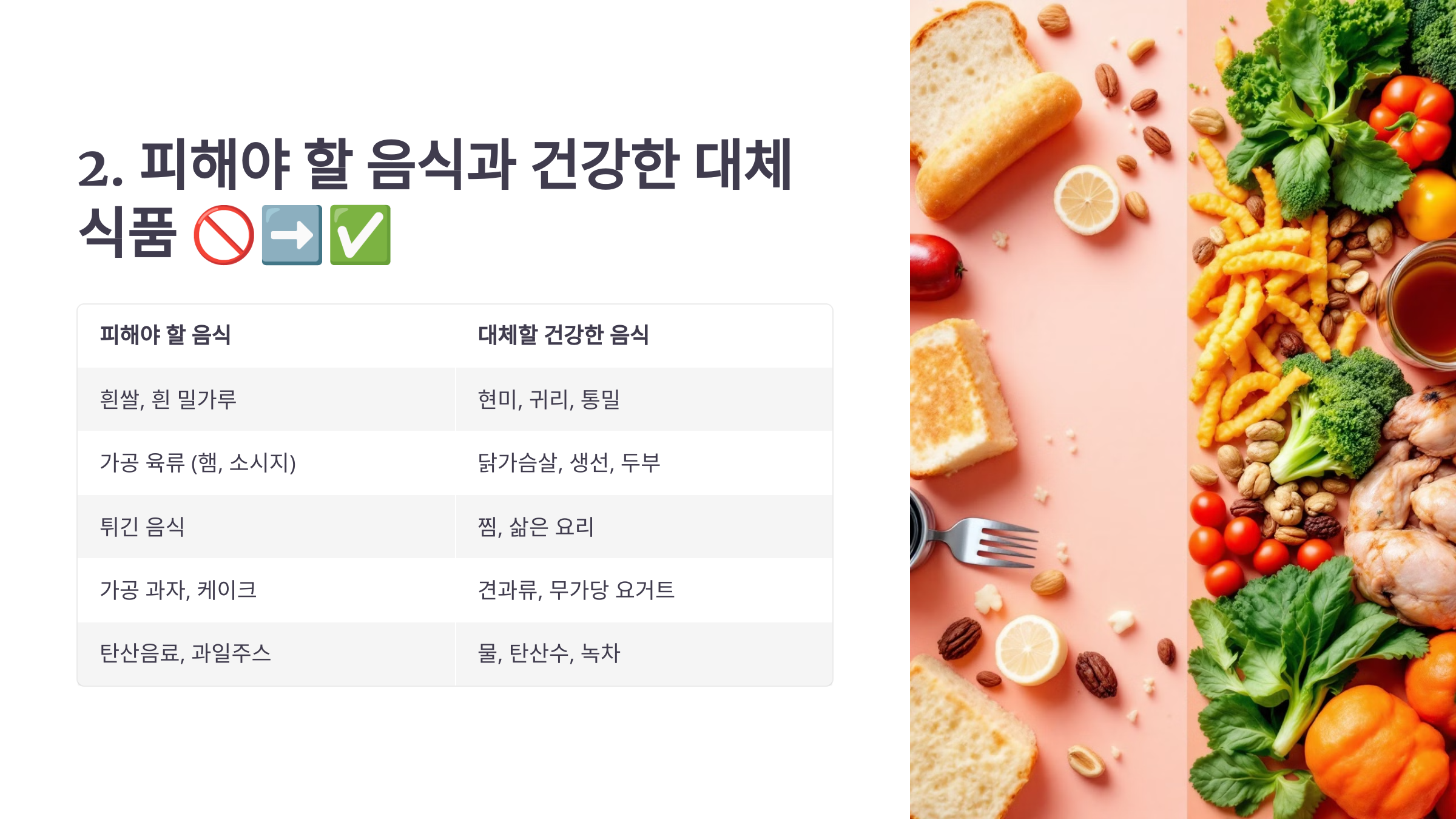 2. 피해야 할 음식과 건강한 대체 식품 🚫➡️✅