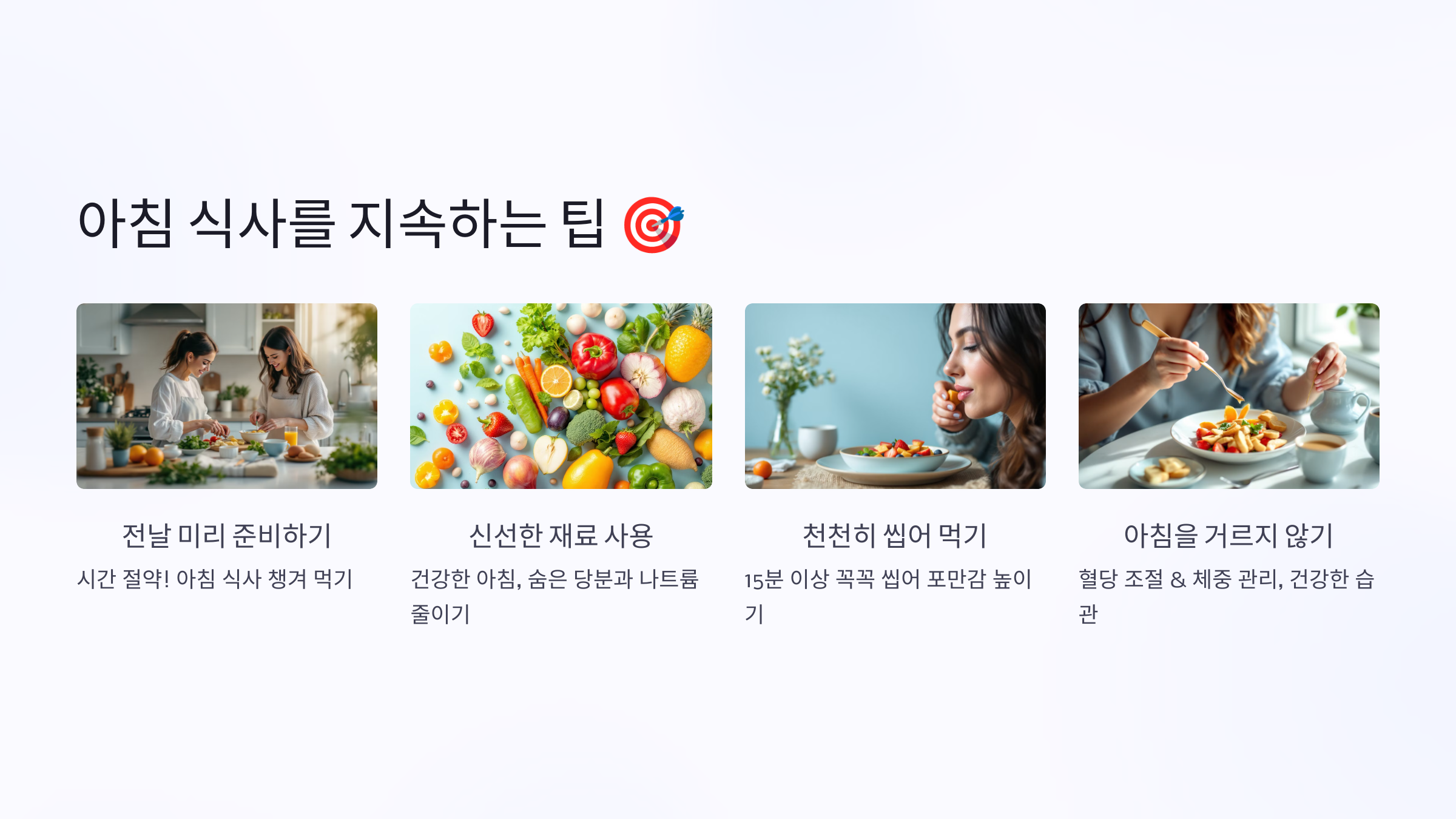 - ✔️ 아침을 거르지 않기 – 혈당 조절과 체중 관리에 중요