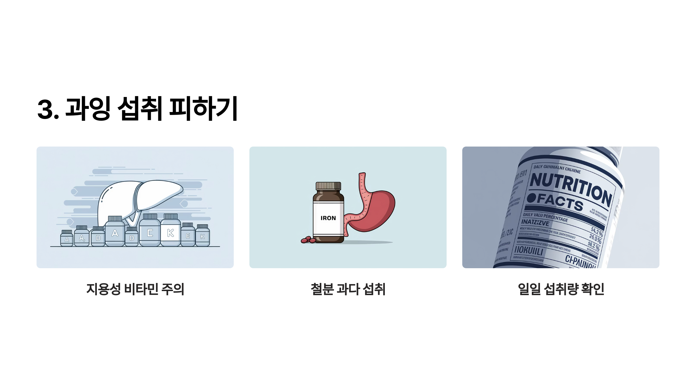 - 철분: 과다 섭취 시 위장 장애, 간 손상 등이 생길 수 있어요.