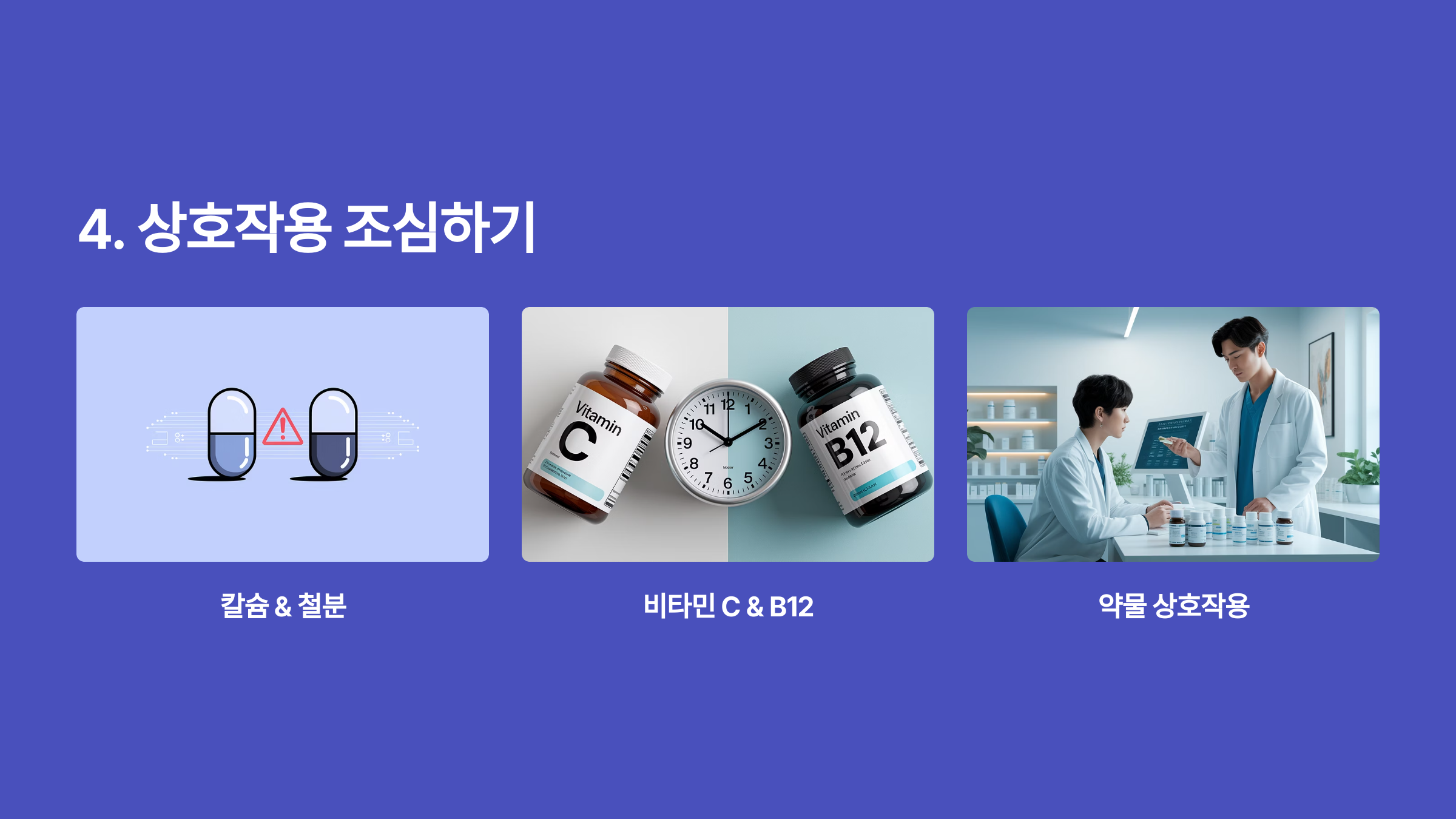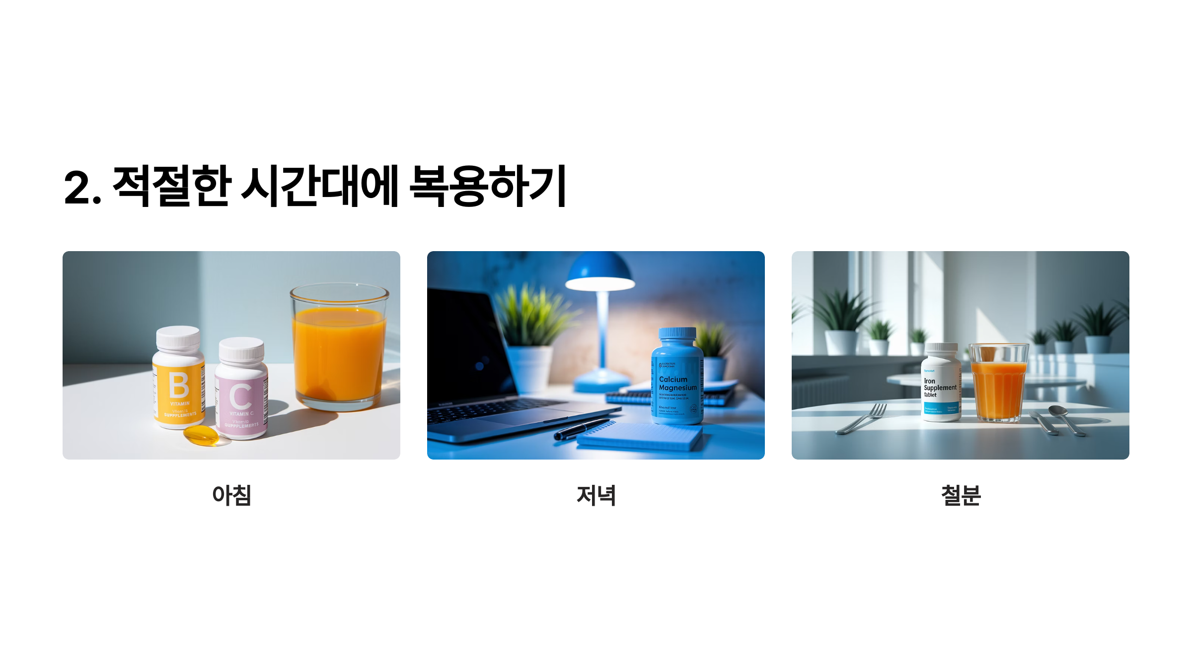 - 비타민 C & B12: 비타민 C는 B12의 흡수를 방해할 수 있어요. 최소 2시간 간격 두기!