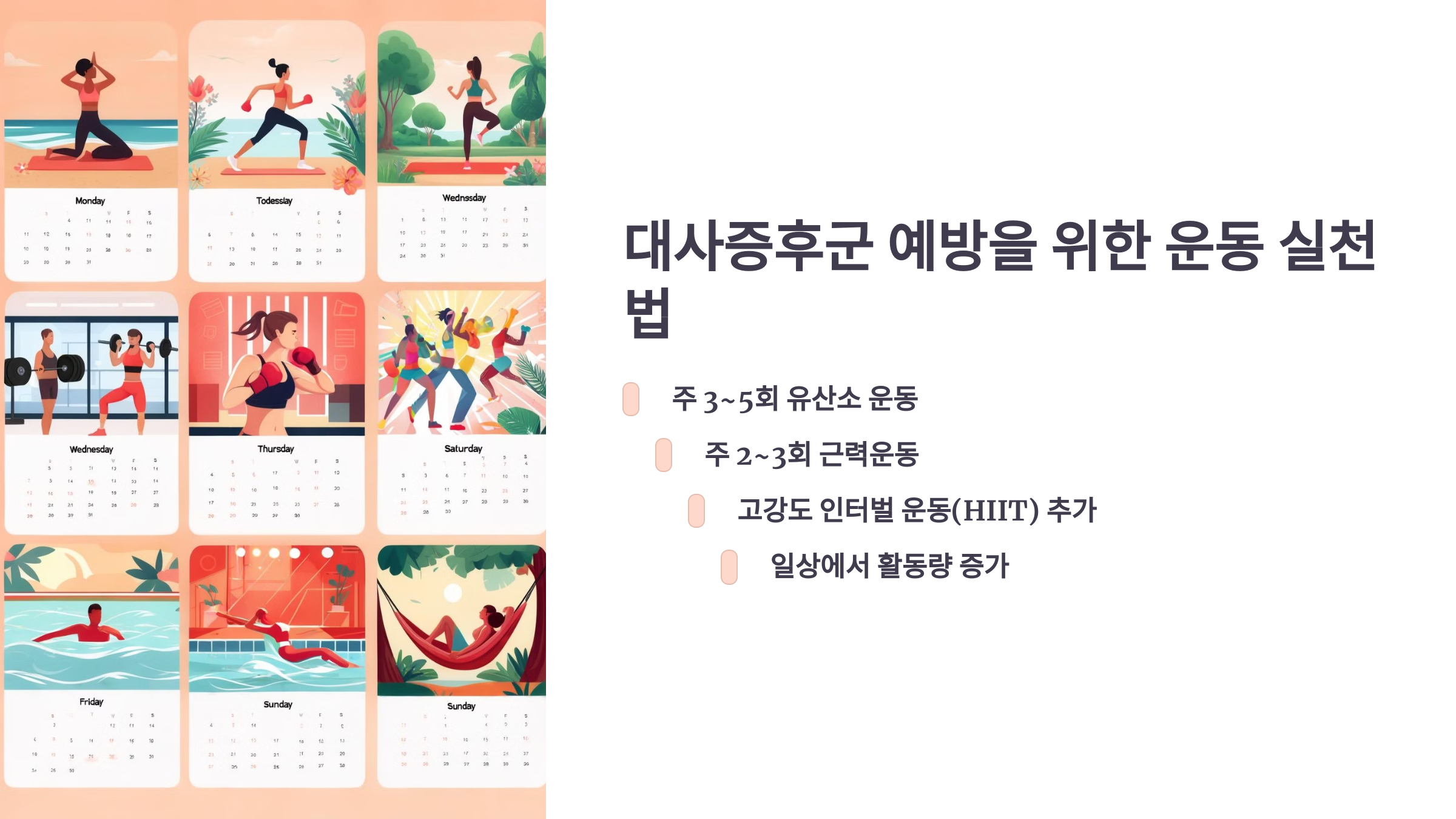 유산소 운동과 근력운동을 병행하면 대사증후군 예방 효과가 극대화됩니다.