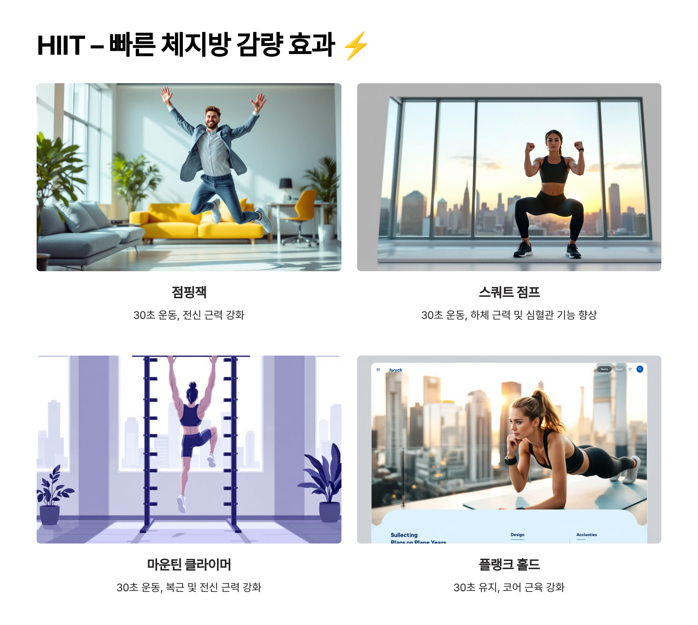 ⚠️ 주의: HIIT 운동은 강도가 높으므로, 자신의 체력에 맞게 조절하고 충분한 휴식을 가져야 합니다!