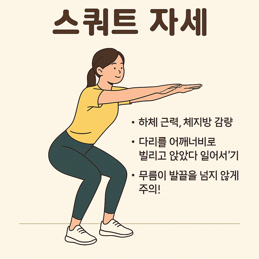 | 앉았다 일어서기 | 엉덩이를 뒤로 빼듯 천천히 앉았다가 일어서기 |