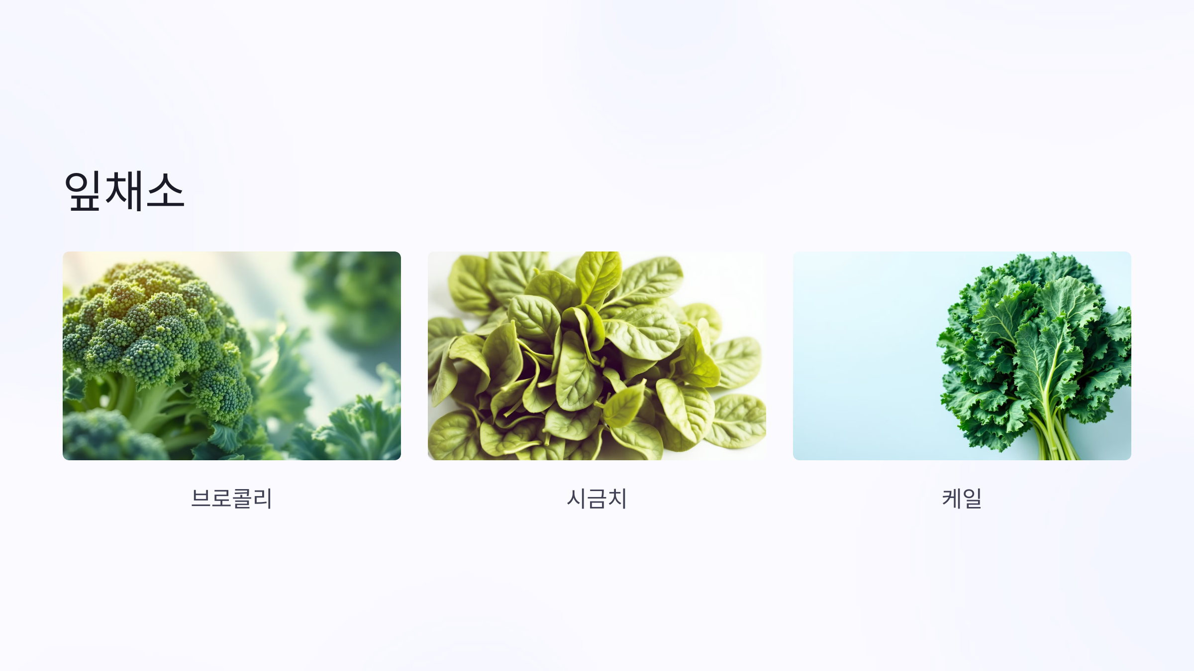 - 브로콜리, 시금치, 케일 같은 잎채소는 섬유와 항산화제가 풍부해 혈관 건강에 탁월합니다.