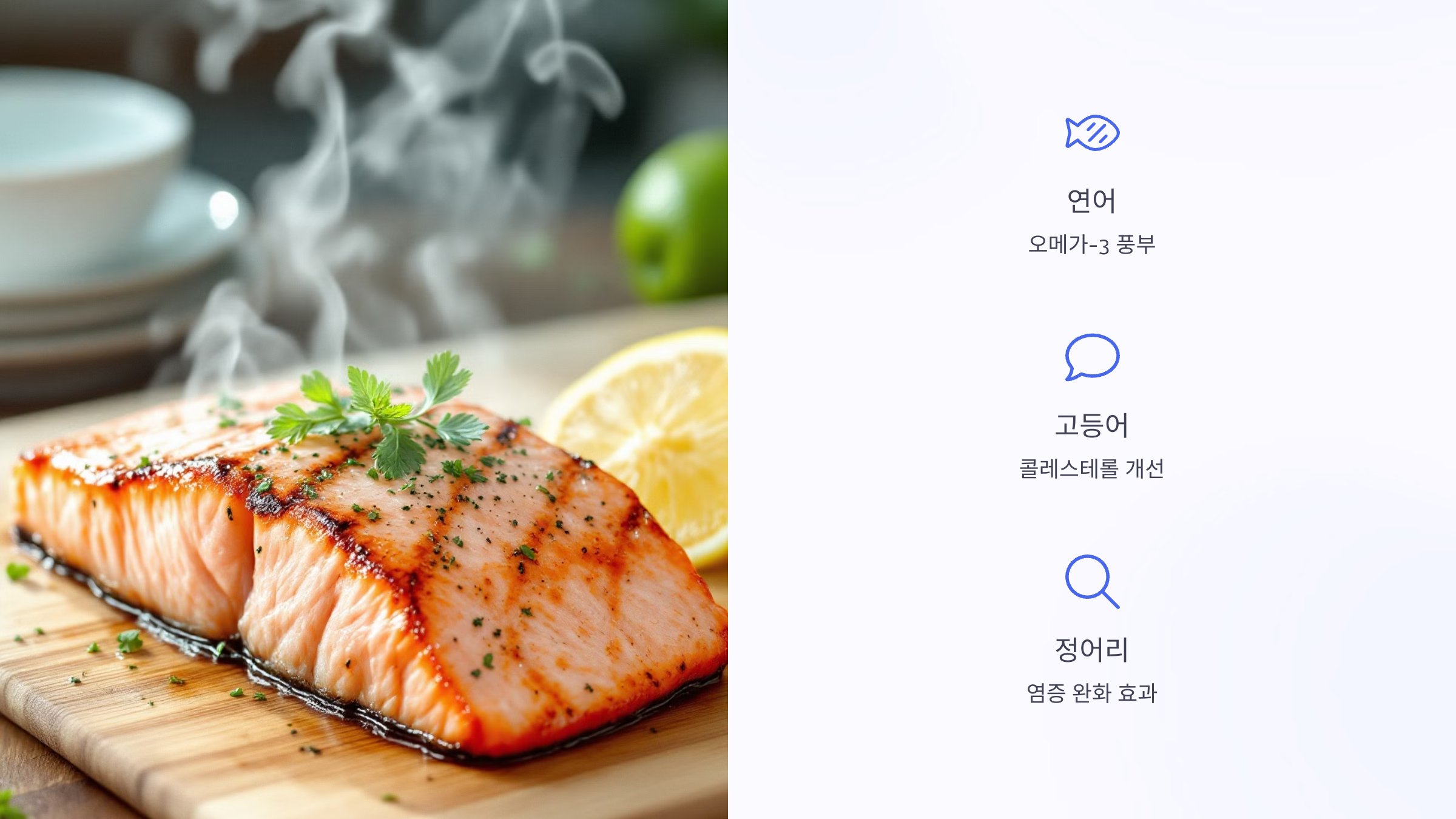 - 연어, 고등어, 정어리 같은 생선에는 오메가-3 지방산이 풍부하여 콜레스테롤 개선, 염증 완화에 효과적입니다.