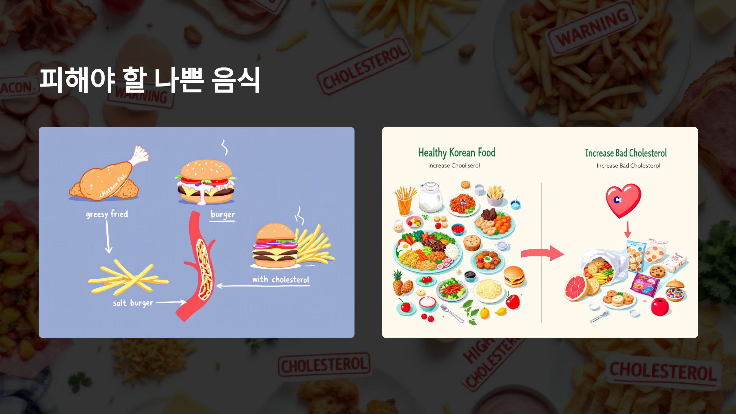 이 음식들은 콜레스테롤 수치를 높이고, 혈관 건강을 해칠 수 있어요. 주 1회 미만으로 제한하거나 가급적 피하는 것이 좋아요.