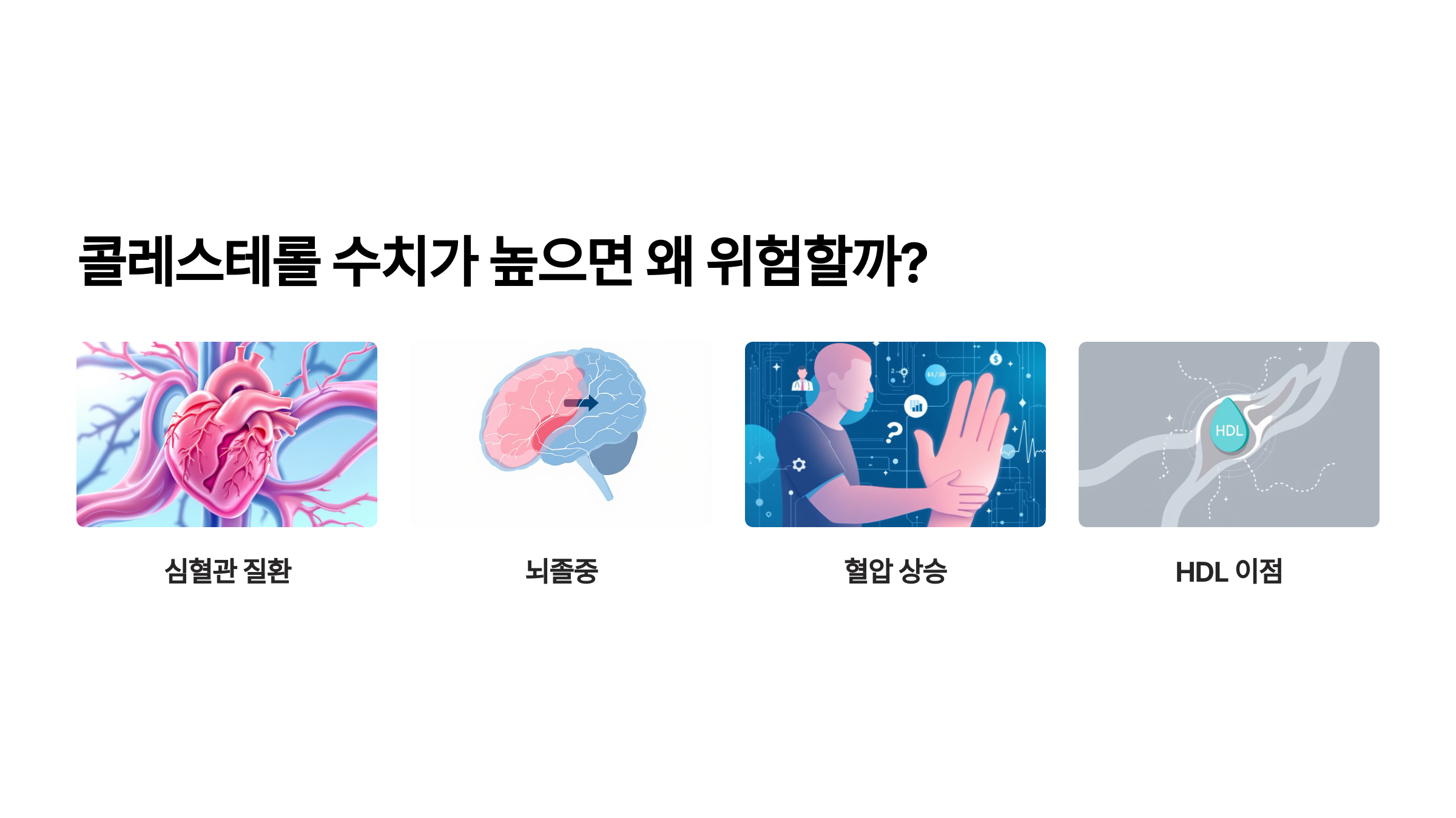콜레스테롤 수치가 높아지면 심혈관 질환, 뇌졸중, 동맥경화 위험이 증가해요. 혈관이 막히면 심장과 뇌에 산소와 영양분 공급이 원활하지 않아 위험한 상황이 될 수 있어요.
