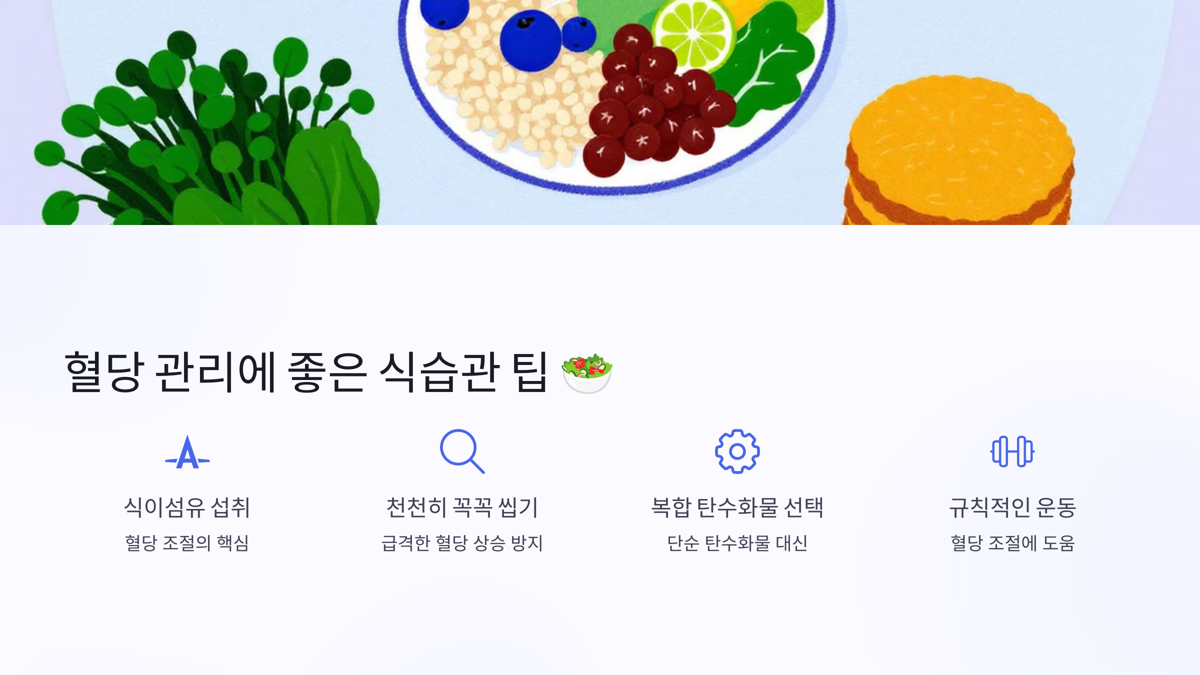 - ✔️ 천천히 꼭꼭 씹어 먹기 – 혈당이 급격히 오르는 것을 방지합니다.