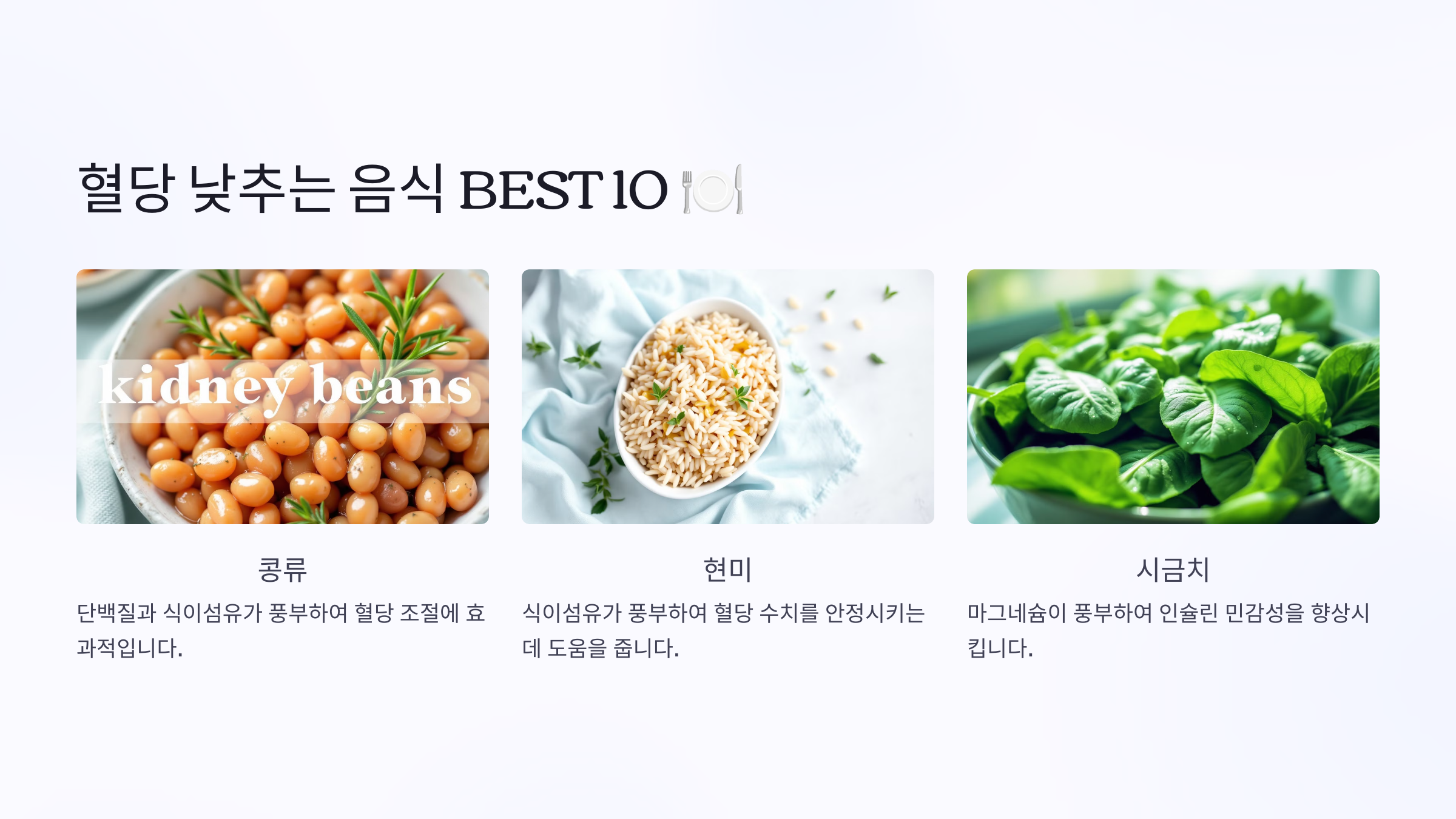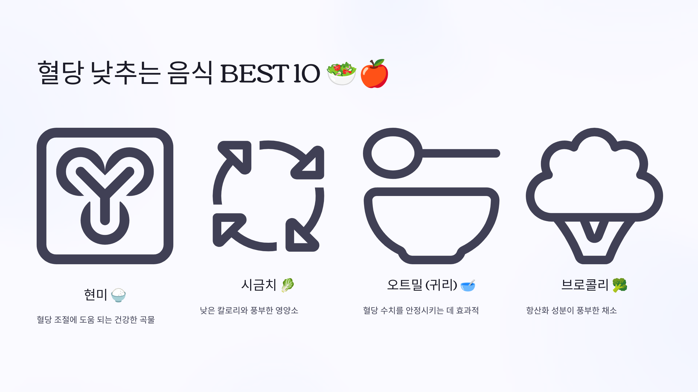 그렇다면 어떤 음식이 혈당을 조절하는 데 도움을 줄까요? 지금부터 혈당 낮추는 음식 BEST 10을 확인해 보세요! 👇