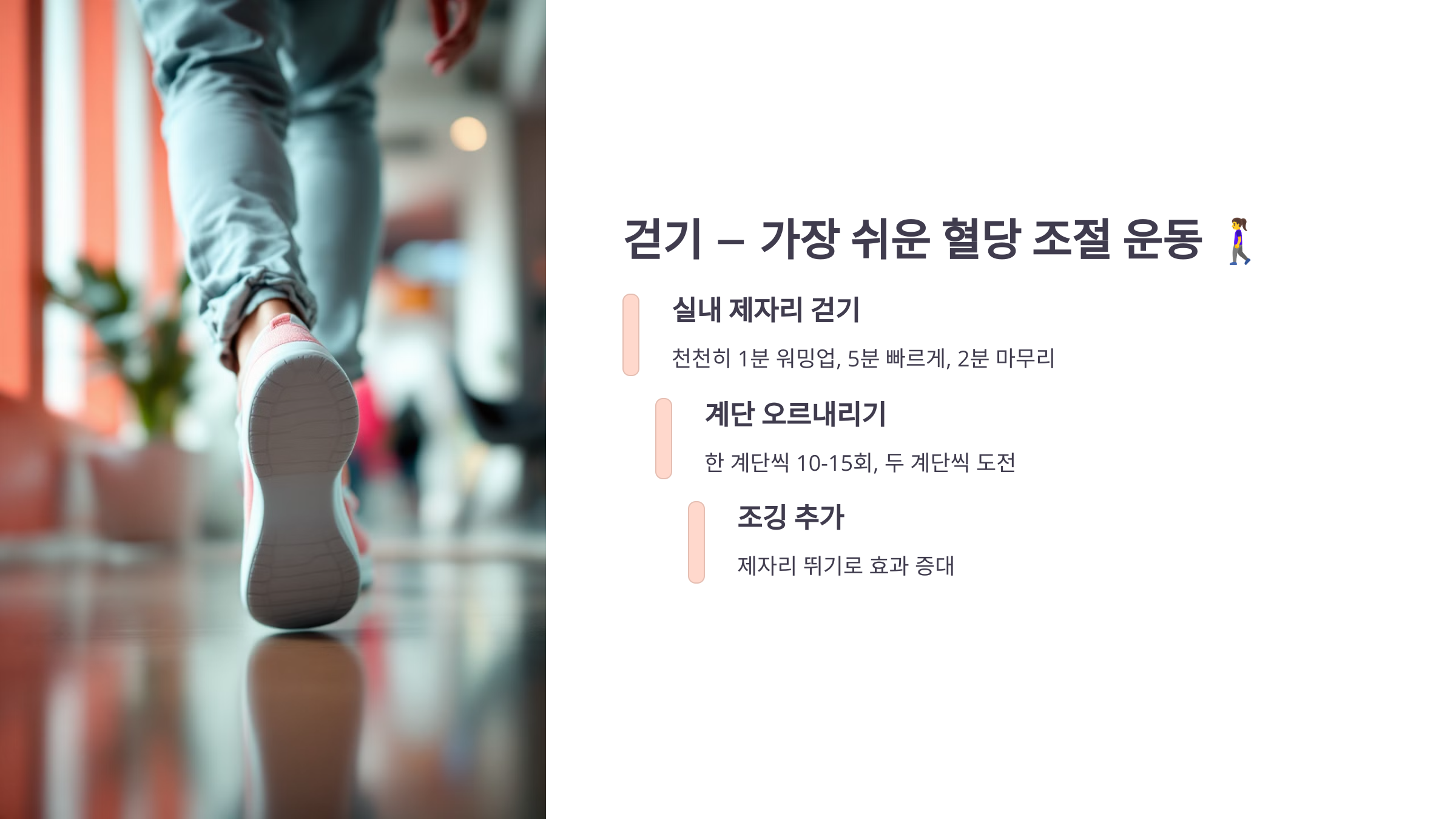 💡 Tip: 조깅을 추가하면 효과가 더 커요! 실내에서라도 제자리 뛰기를 병행하면 혈당 조절에 더욱 효과적입니다.