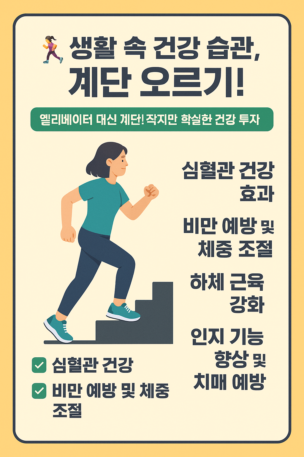 계단 오르기는 돈도, 장비도, 시간도 많이 들지 않지만 심장, 근육, 두뇌까지 다 챙길 수 있는 가성비 최고의 건강 습관입니다!