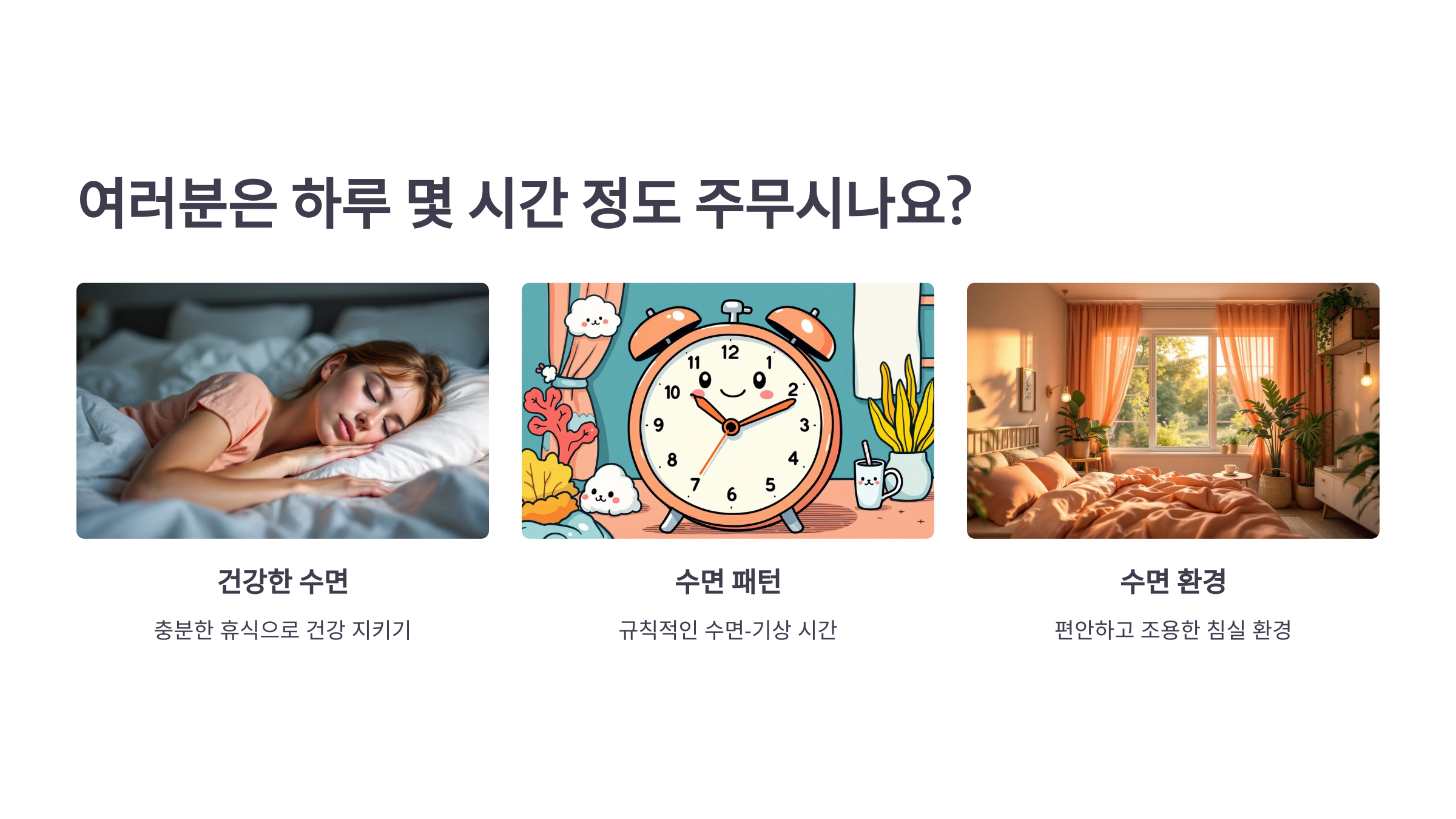 💬 여러분은 하루 몇 시간 정도 주무시나요? 충분한 수면을 위한 나만의 방법이 있다면 댓글로 공유해주세요!