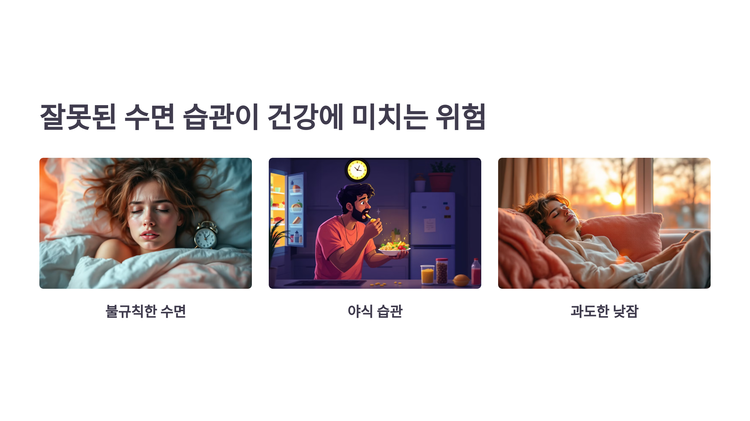 | 대사증후군 위험 증가 | 하루 6시간 미만의 수면을 취하는 성인은 대사증후군 발생 위험이 30% 증가하며, 이는 혈당 조절 문제, 혈압 상승, 복부비만과 연관이 있습니다. |