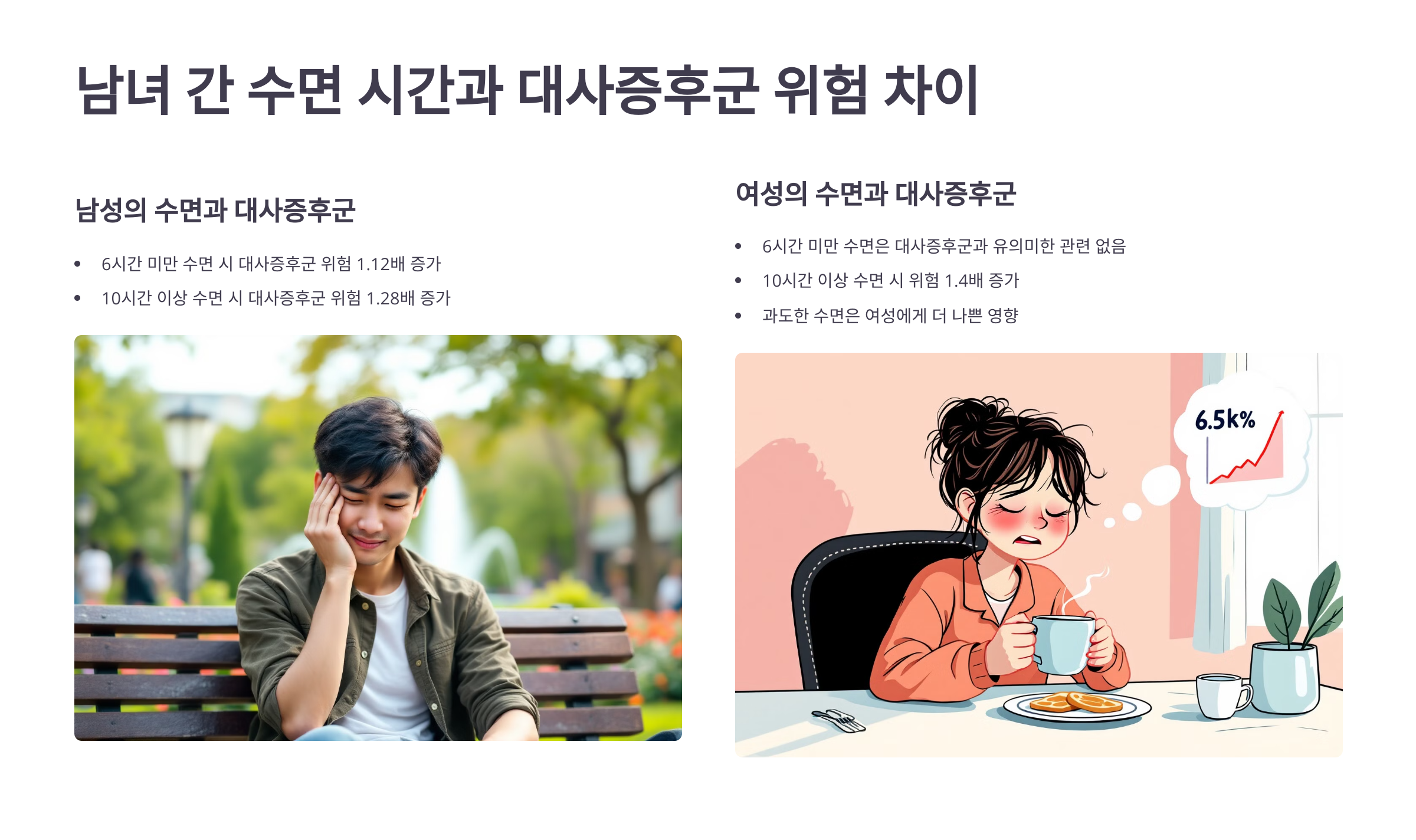 연구에 따르면 남성과 여성의 수면 부족에 따른 대사증후군 위험이 다르게 나타납니다. 남성은 수면 부족과 대사증후군 사이에 뚜렷한 연관성이 있으며, 여성은 오히려 과도한 수면이 대사 건강에 부정적인 영향을 미칠 수 있습니다.