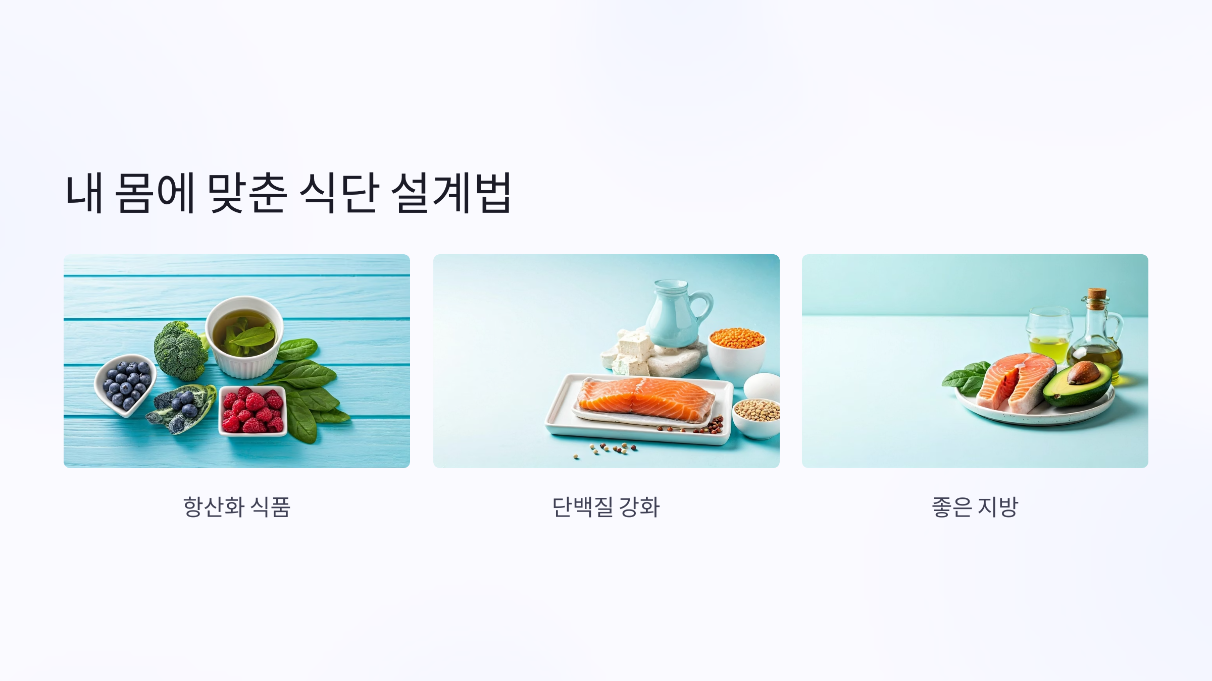- 🥗 식사마다 항산화 식품 포함: 블루베리, 토마토, 시금치 등 컬러푸드를 매 끼니 챙기세요.