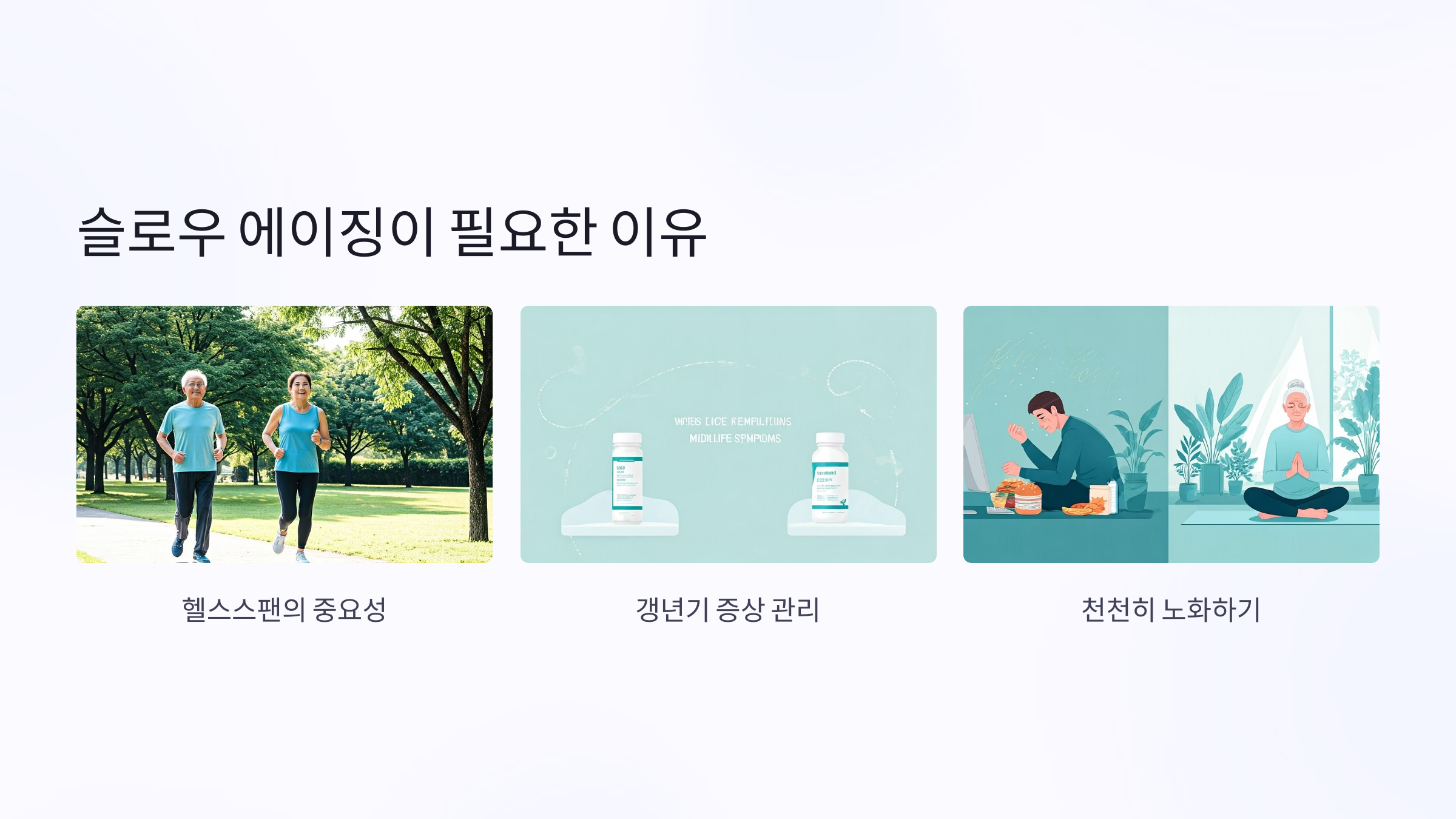 슬로우 에이징은 이런 문제를 사전에 막고, 내 몸의 리듬에 맞춰 천천히 노화하도록 돕는 전략입니다.