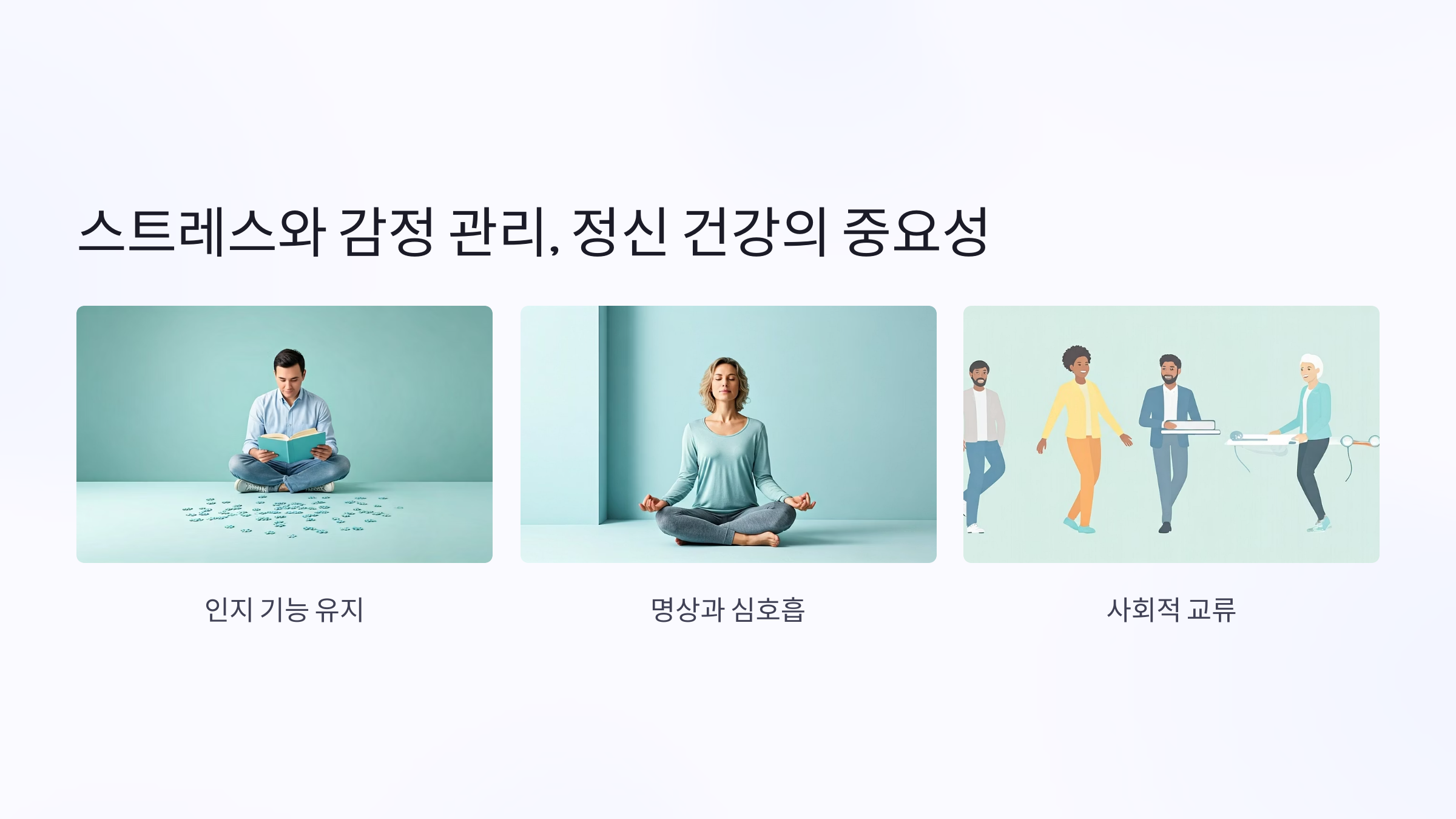 - 👥 사회적 교류 유지: 대화, 동호회 활동 등은 외로움 해소와 감정 안정에 좋아요.
