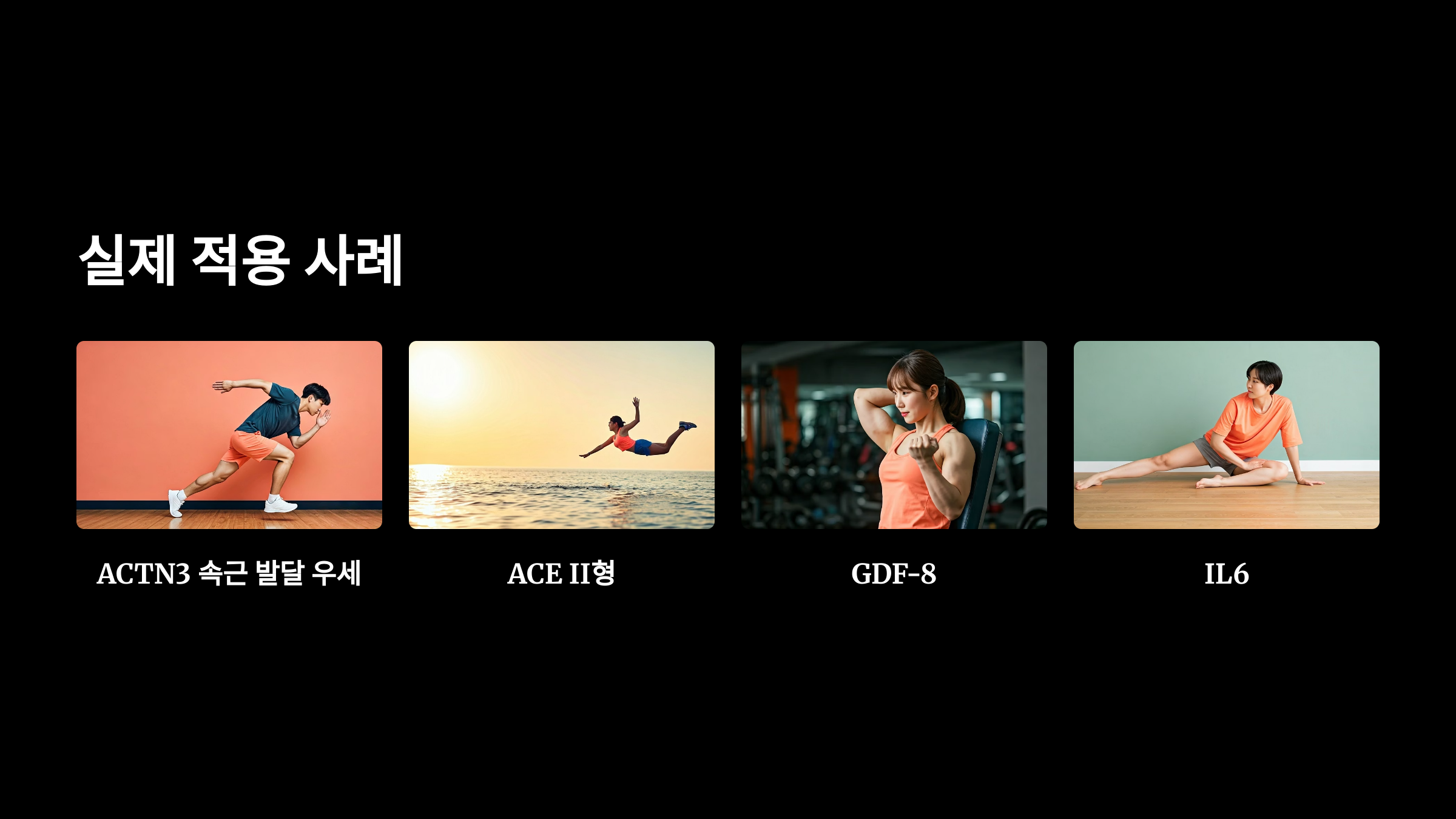 - ACE: 지구력 유전자 – 마라톤, 수영, 사이클 등 장시간 운동에 유리