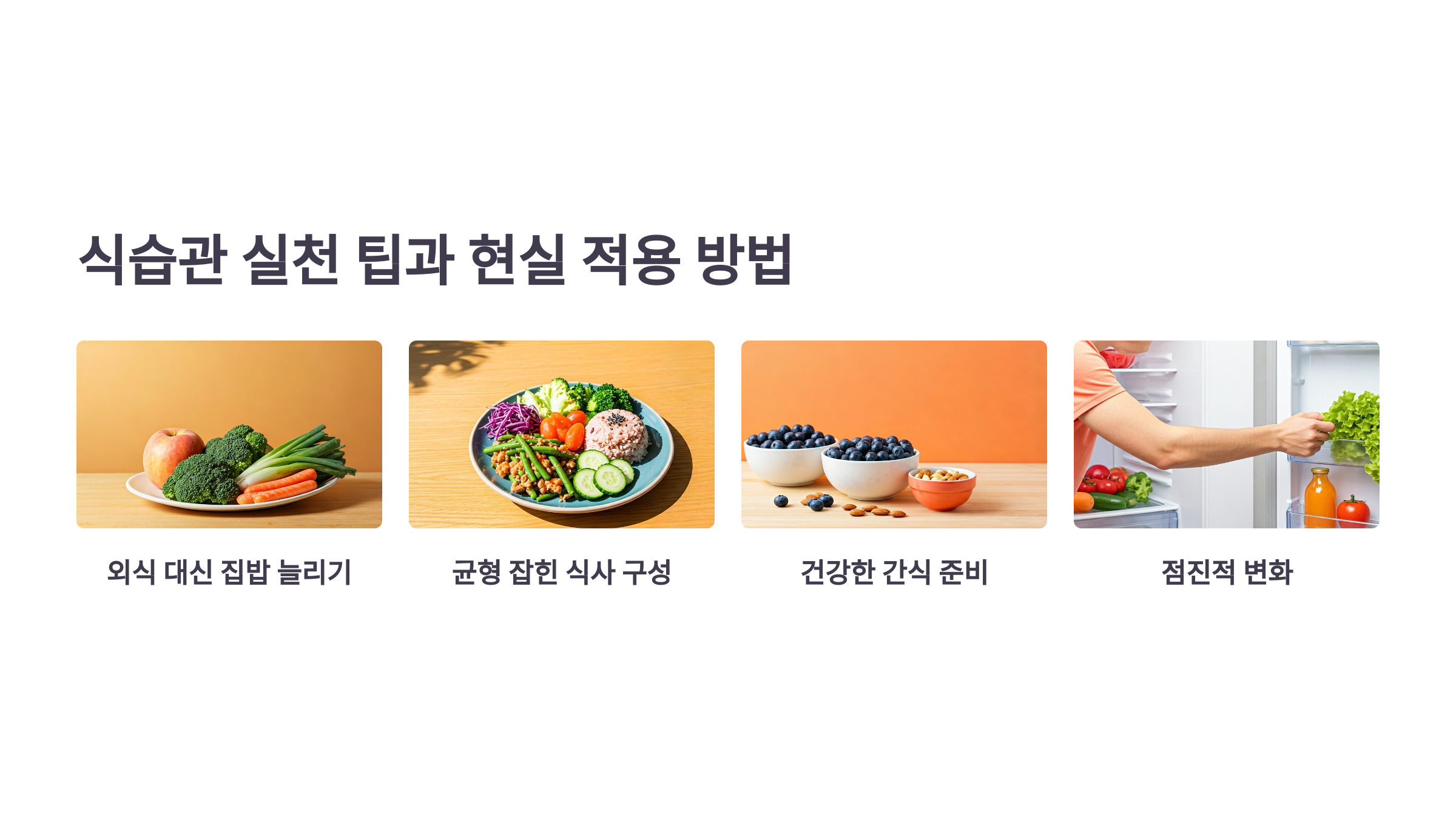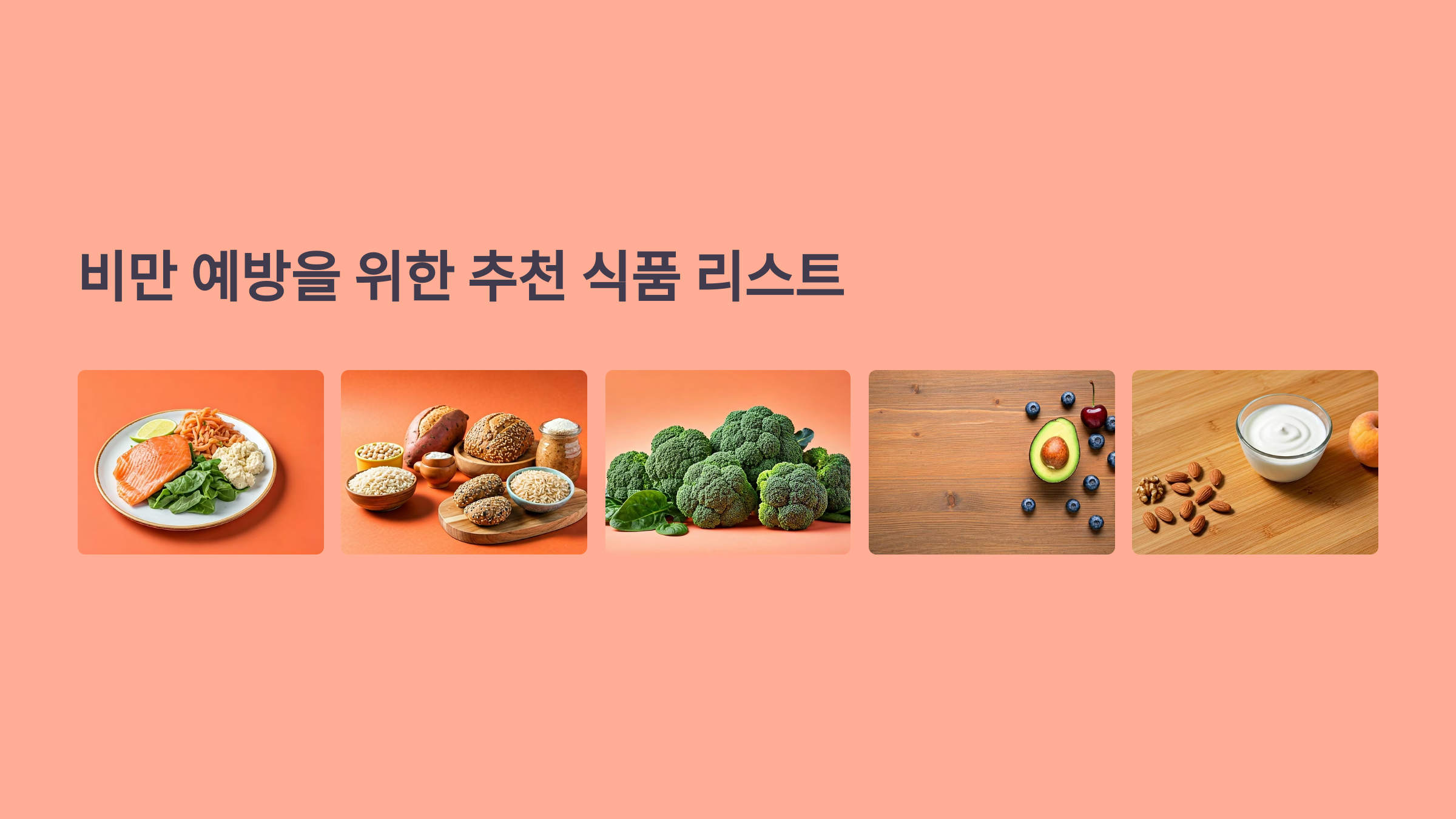 - 채소와 과일 하루 5회: 항산화, 식이섬유, 포만감 제공.